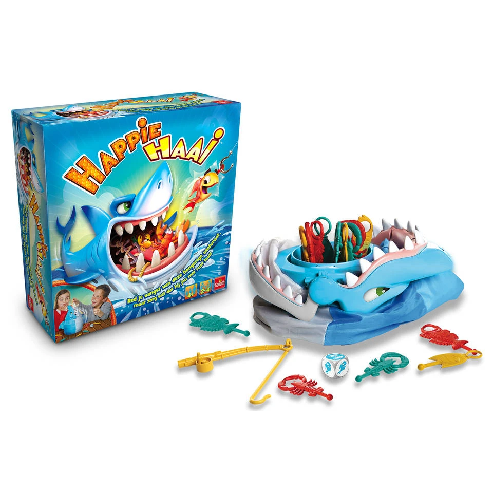 Kinderen zijn uren zoet met Happie Haai! Gooi de dobbelsteen om te weten hoeveel vissen je moet vangen. Haal de vissen dan uit het water met je hengel. Maar pas op… als de haai hapt, verlies je alles. De speler met de meeste vissen wint het spel.