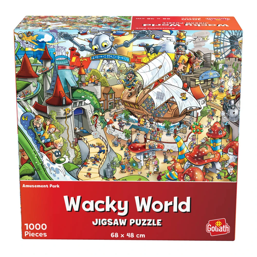 Superpuzzelplezier met deze Wacky World pretparkpuzzel. In de doos zitten 1000 stukjes die samen een afbeelding van een chaotisch pretpark vormen.