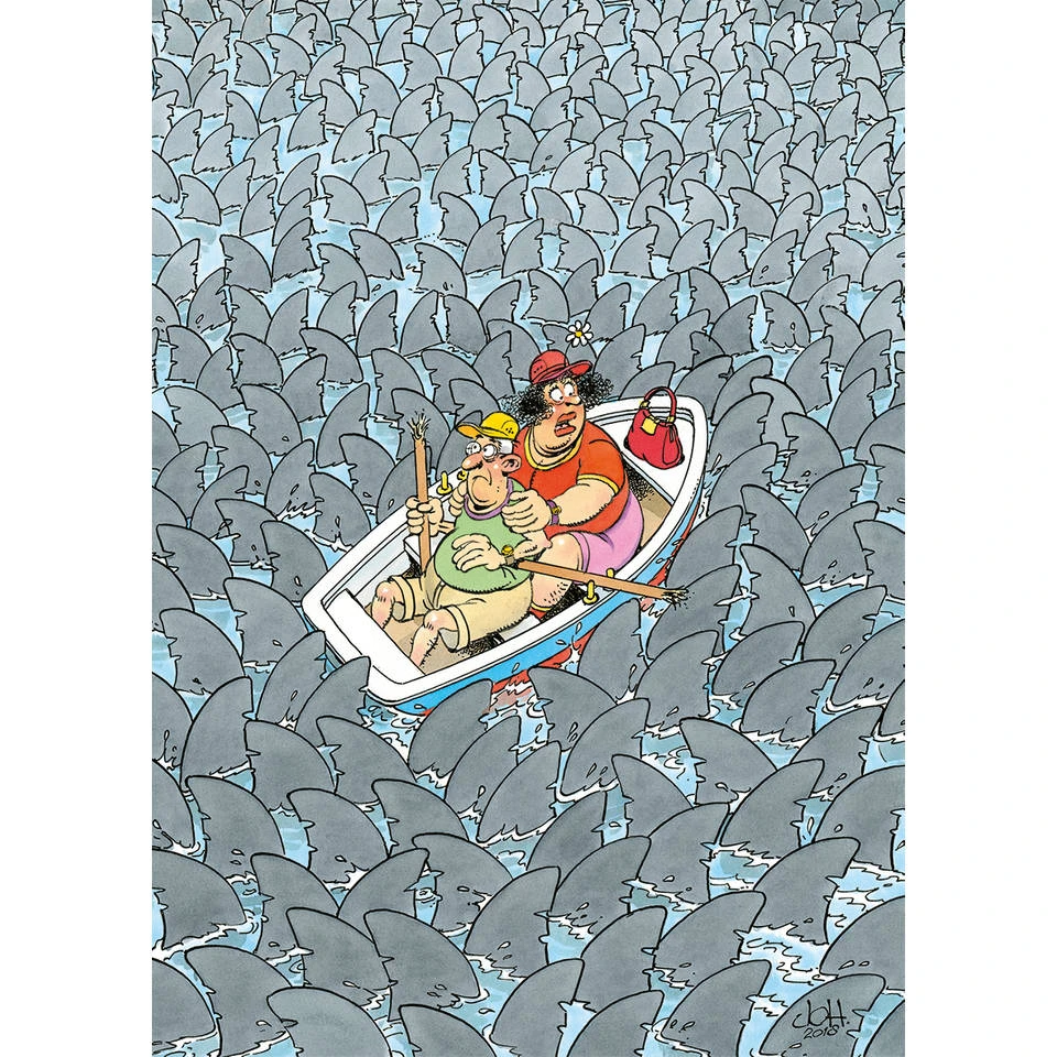 Schoonmoeder en schoonvader hebben een roeiboot gehuurd om een rustige dag op het water door te brengen, maar het loopt niet helemaal zoals ze hadden verwacht! Houden ze het hoofd koel in deze haai waanzin? Jan van Haasteren Expert puzzles zijn uitdagende, grappige illustraties, in een comfortabel 500 stukjes formaat. Een must-have voor alle puzzelfans. Eén of twee beroemde karakters uit de familie gaan op hun eigen kleine avontuur. Laat je niet voor de gek houden en wees voorbereid op het expert niveau in puzzelen! Een Jan van Haasteren puzzel is meer dan een gewone legpuzzel: het is een avonturenserie, met vertrouwde hoofdrolspelers in een eindeloos decor vol absurde details. Ontdek alle doldwaze avonturen van de Jan van Haasteren-familie.