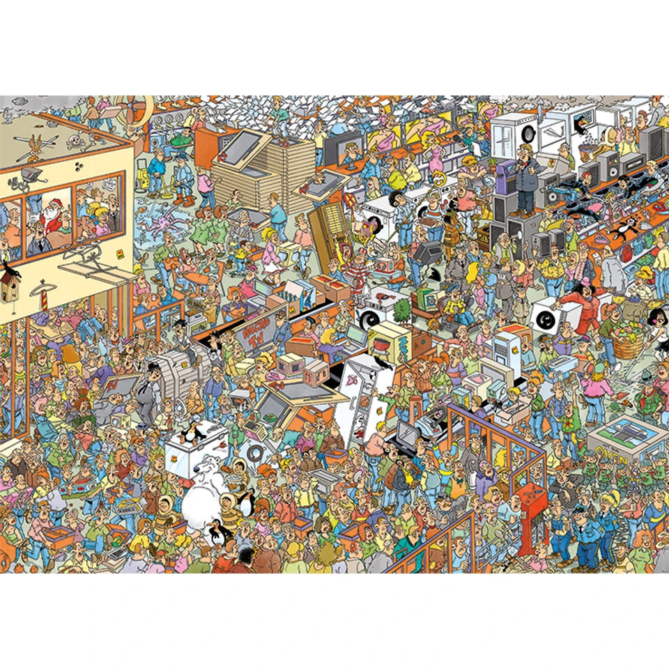 Met deze Jumbo Jan van Haasteren puzzel heb je dubbel puzzel plezier. Het thema voor de twee puzzels van 1000 stukjes is shoppen voor de feestdagen.