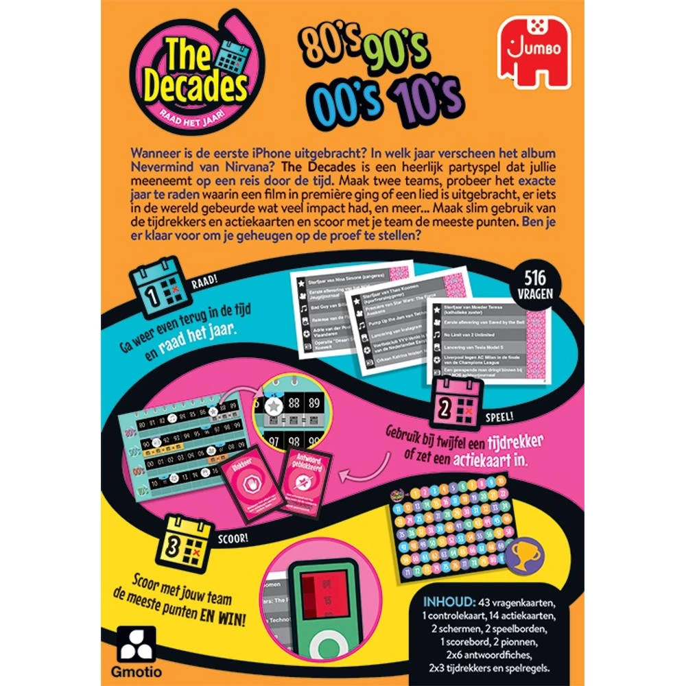 Dit Jumbo The Decades spel brengt je terug in de tijd. Je zal samen met je team antwoord moeten geven op vragen betreffende het verleden. Maak hierbij gebruik van de tijdrekkers en actiekaarten. Er zijn twee teams die het tegen elkaar moeten opnemen. Het team dat de meeste vragen goed heeft is het winnende team. Ben jij klaar om je kennis te testen?